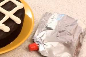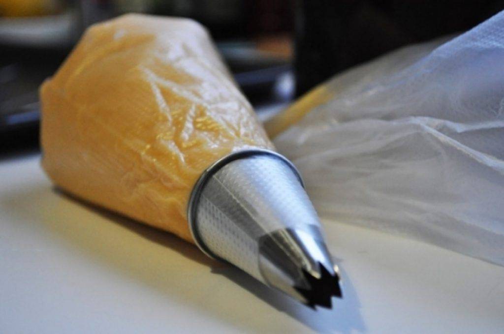 Если вы нечасто готовите выпечку, то нет необходимости покупать специальное приспособление. Кондитерский шприц (мешок) просто сделать самим. Берем пакет от майонеза с дозатором, отрезаем дно и хорошенько промываем внутри. Затем наполняем кремом и приступаем украшать сладости!