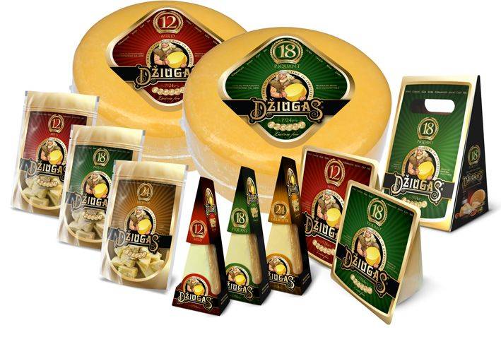 Сыр выдерживается разные сроки: 12 месяцев, 1,5, 2, 3, 4 года. Вкус и аромат ярко выраженные, пряные. Цвет разнится в зависимости от выдержки, может быть, как ярко-желтым, так и бледноватым. Консистенция плотная. Корочка твердая. Продукт легко режется. Dziugas легко усваивается.