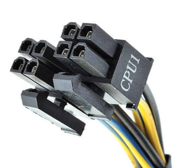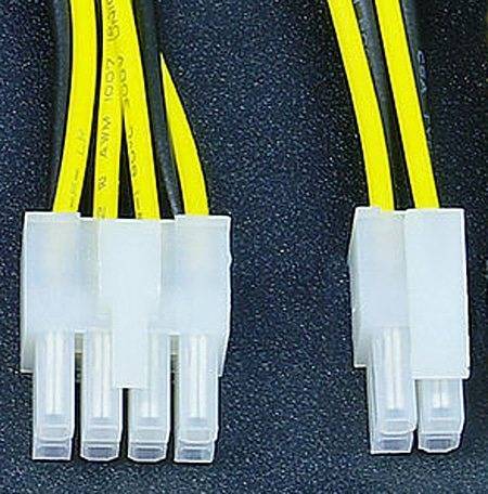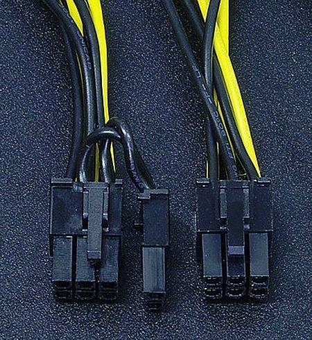 Расщепляемая (слева на фото), естественно, может использоваться для питания карты с шестиконтактной розеткой. Но сегодня появились такие «звери», которым даже 8-контактного разъёма недостаточно. Для таких карт нужен БП с двумя вилками — 6+8 и даже 8+8 контактов.