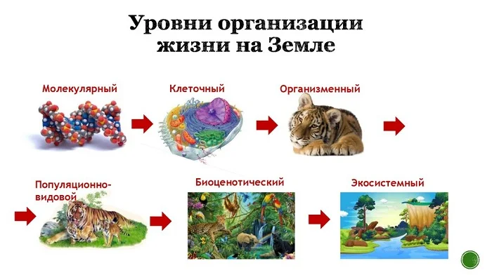| Иерархичность организации | Жизнь проявляет себя одновременно на многих уровнях организации, каждый из которых имеет свои свойства и особенности |