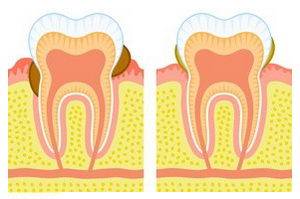 Зубной камень — это налет, который со временем отвердел в связи с плохим и нерегулярным соблюдением гигиены ротовой полости. Зубной камень бывает наддесневым и поддесневым. Он имеет желтовато-белую окраску, хотя на цвет влияет употребление табака и пищевых красителей. У людей старше 40 лет можно заметить камень на зубах коричнево-зеленоватого цвета, иногда ближе к черному. Опять же, это говорит о том, что гигиена отсутствует.