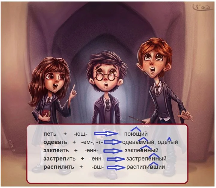 Помогите Гарри Поттеру и его друзьям придумать причастия от глаголов и найти суффиксы причастий в словах: говорить, петь, одевать, заклеить, застрелить, распилить.