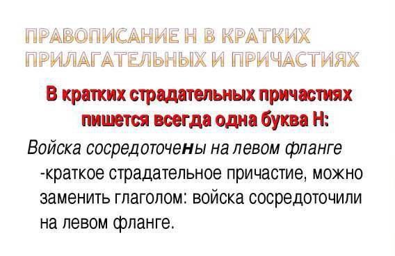 Суффиксам -нн- и -енн- (-ённ-) полных страдательных причастий соответствуют суффиксы -н- и -ен- (-ён-) кратких.