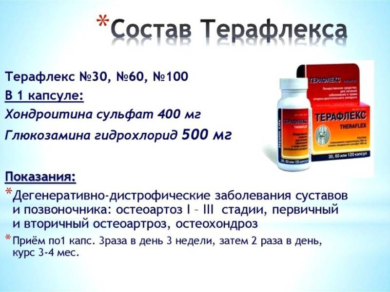 Это комбинированное лекарство немецкого производства. Состав медикамента идентичен Артре, но дозировка хондроитина в Терафлексе немного ниже (400 мг). Средство считается эффективным для лечения ранних и запущенных дегенеративно-дистрофических процессов в суставах. Показания к применению лекарства: