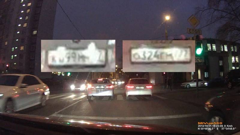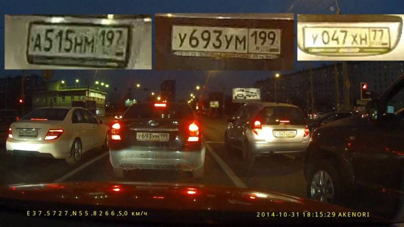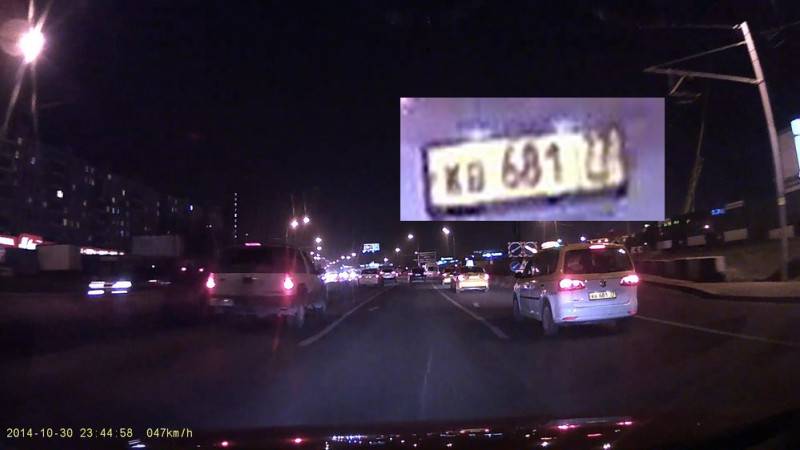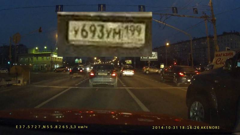 Финал – левая машина выезжает на «зебру», в это время с ней поравнялся совершавший обгон автомобиль. Если бы тот самый обгонщик, скажем, оцарапал вашу машину и попытался скрыться, самый точный номер дала бы запись с AdvoCam, с минимальной погрешностью – BlackVue. Именно у него «основные» три цифры различимы лучше по сравнению с Mio и Akenori.