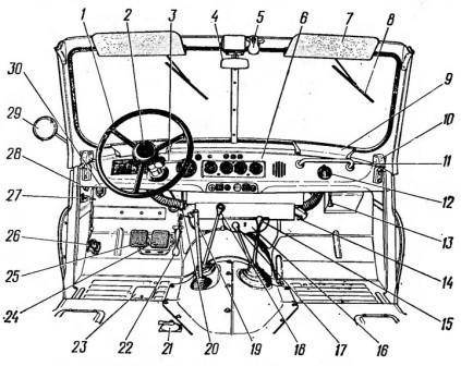 Рулевое колесо 1 расположено с левой стороны. В центре рулевого колеса помещена кнопка 2 звукового сигнала. Справа на рулевой колонке расположена рукоятка 3 переключателя указателей поворота. Рукоятка автоматически возвращается в нейтральное положение при повороте рулевого колеса в обратную сторону (движение автомобиля по прямой). На центральной стойке ветровой рамы установлено внутреннее зеркало 4 заднего вида.