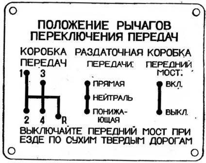 Заслонка люка открывается подачей рукоятки на себя. Отопитель имеет регулировочные заслонки 14 подачи теплого воздуха к ногам водителя и пассажира. Справа от водителя располагается рычаг 15 включения переднего ведущего моста. По инструкции УАЗ-469 передний ведущий мост включен, когда рычаг занимает переднее положение. На отопителе в средней части имеется крышка 16, она позволяет теплому воздуху поступать в салон кузова. Там же располагается и рычаг 17 управления раздаточной коробкой, который может занимать три положения: переднее положение (по ходу автомобиля) — включена прямая передача; среднее положение — нейтральное; заднее положение — включена понижающая передача. Рядом с водителем располагается рычаг 18 переключения передач, на рукоятке которого нанесена схема переключения передач. Схема положений рычагов коробки передач и раздаточной коробки показана на следующей схеме.
