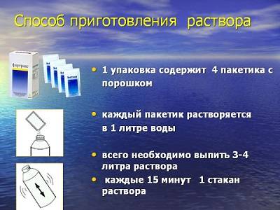 Для приготовления лечебного раствора Фортранс следует развести порошок в теплой воде