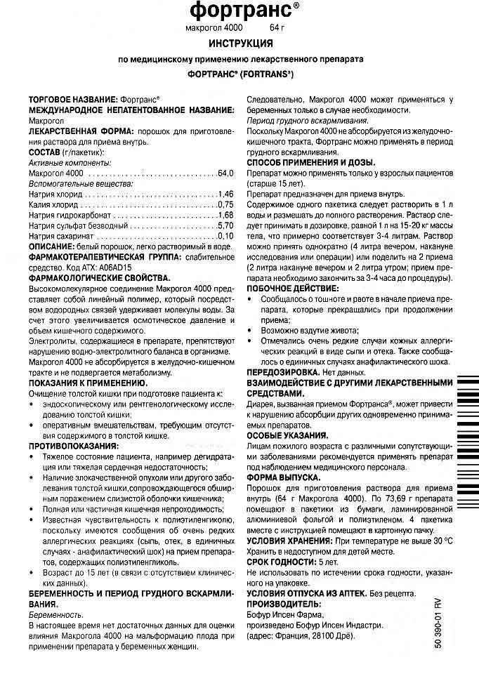 Действие Фортранса – это мощный слабительный эффект, в результате которого удаляется содержимое всех отделов толстой кишки, в том числе и верхних ее частей. Такое слабительное действие выгодно отличает Фортранс от клизмы или иных послабляющих препаратов, выводящих наружу только сформировавшиеся каловые массы, находящиеся в нижних отделах толстой кишки. При приеме обычного слабительного препарата или постановке клизмы, верхние отделы толстой кишки остаются загрязненными остатками пищи и полусформированными каловыми массами. Для проведения различных оперативных вмешательств или диагностических исследований состояния толстой кишки такое очищение является недостаточным. Поэтому в настоящее время в качестве подготовки к исследованию состояния толстой кишки (например, колоноскопии, ирригографии, ирригоскопии и т.д.) или проведению оперативных вмешательств используется Фортранс – препарат, позволяющий удалить из просвета кишечника все его содержимое, создавая, тем самым, идеальные условия для врачебных манипуляций.