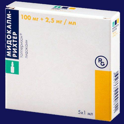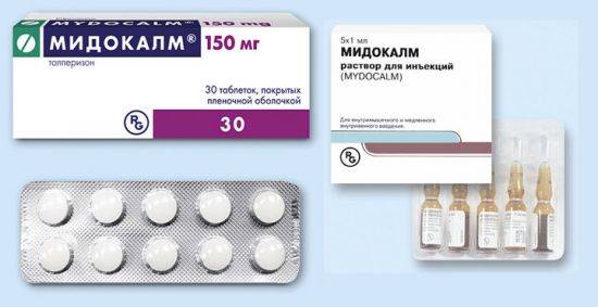 - Мидокалм — миорелаксант. Лекарственное средство устраняет мышечные спазмы за счет блокирования полисинаптических спинномозговых рефлексов, уменьшения токсичности стрихнина, подавления вызываемой им повышенной рефлекторной возбудимости. Скелетные мышцы расслабляются вследствие повышения активности тормозных нейронов. Отмечается угнетение спинальных и висцеральных рефлексов, снижение выраженности болевого синдрома.