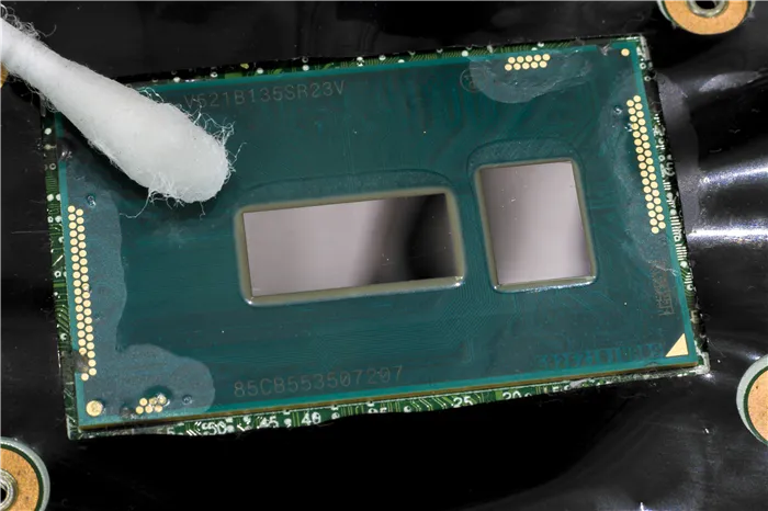 - Процессор и радиатор нужно очистить от старой пасты. Можно использовать вату или туалетную бумагу. Иногда паста не оттирается. Ее можно удалить с помощью изопропилового спирта. Хотя обычно с этим проблем не возникает.