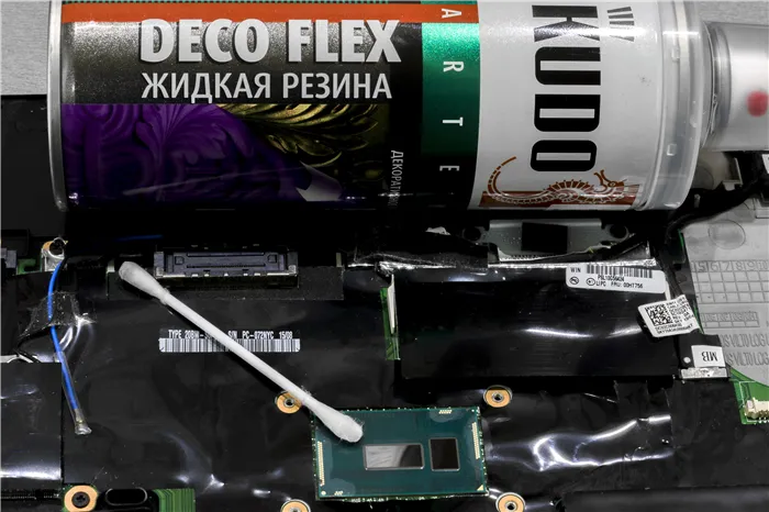 Далее, вернул обратно черную защитную пленку и сверху еще раз прошелся жидкой резиной вокруг самого кристалла процессора.