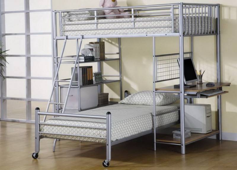 - кровати-чердаки, верхний ярус которых предназначен для отдыха, а нижний является комбинированным (здесь располагаются рабочий стол, полки, выдвижные ящики, встроенные шкафы и тумбы для одежды).