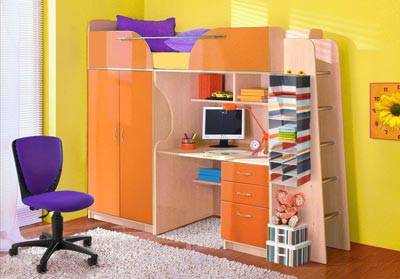 - трансформер на одно или два места (нижний ярус может быть выполнен в виде небольшого диванчика, который легко трансформируется в игровую зону, небольшой рабочий стол);