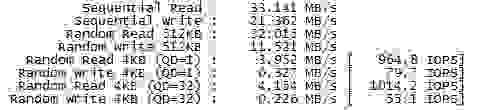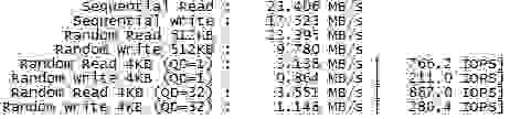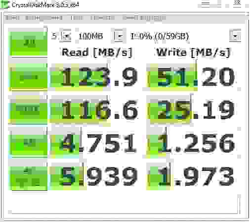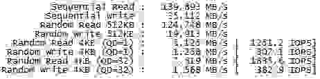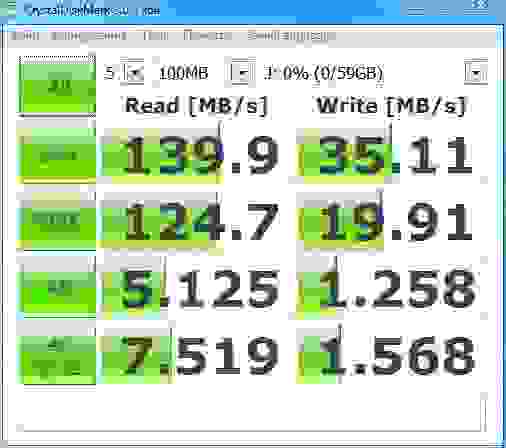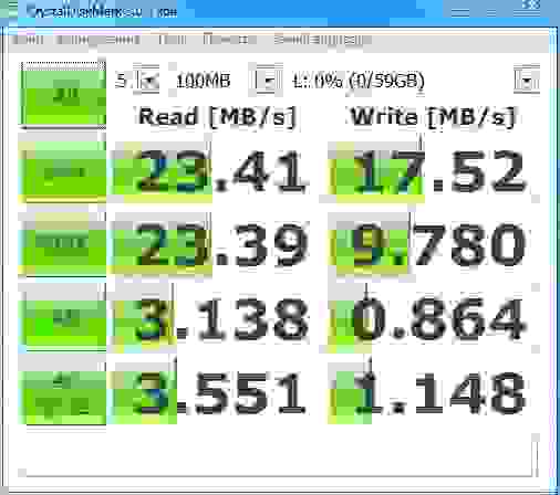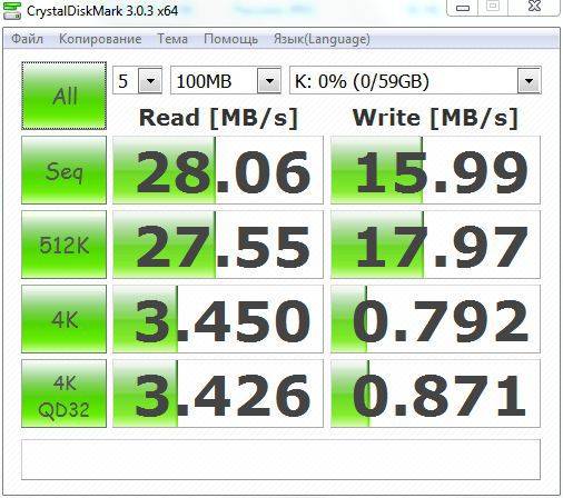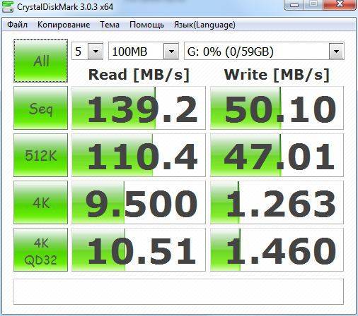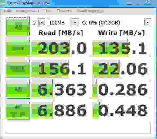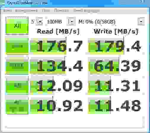 Для теста скорости я специально не стал использовать ПО, написанное моими коллегами. Для проверки скорости работы накопителей была выбрана общедоступная программа CrystalDiskMark версии 3.0.3. Очень простая и понятная софтинка, которая показывает: