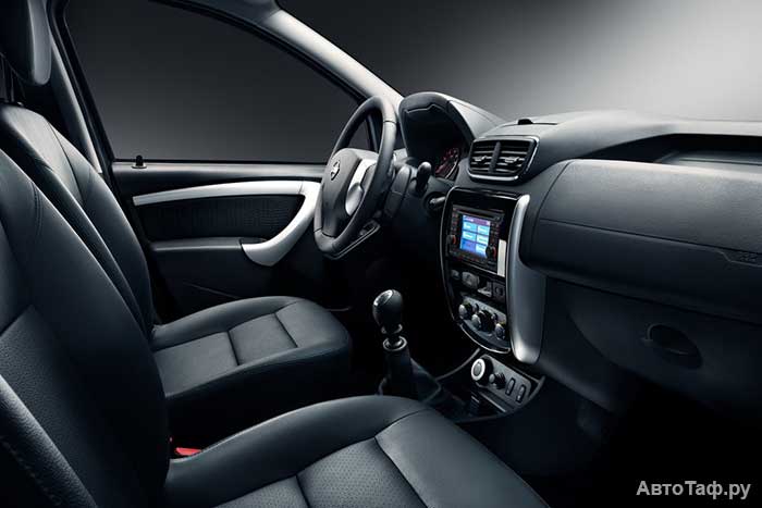 Салон автомобилей имеет схожий интерьер, но при внимательном рассмотрении различия становятся заметными. Так, например, мультимедийная система Террано расположена ниже, чем у Дастера, и имеет меньший размер – 5 дюймов. Разрешение экрана «хромает», элементы плохо видны, и чтобы найти нужную кнопку на сенсоре, приходится отвлекаться от дороги. Это существенный минус мультимедийной системы. Однако к ней подведена камера заднего вида, поэтому неудобство ее расположения компенсируется маленьким преимуществом, которого нет у Дастера. Экран в Дастере имеет более высокое разрешение, его размер – 7 дюймов.