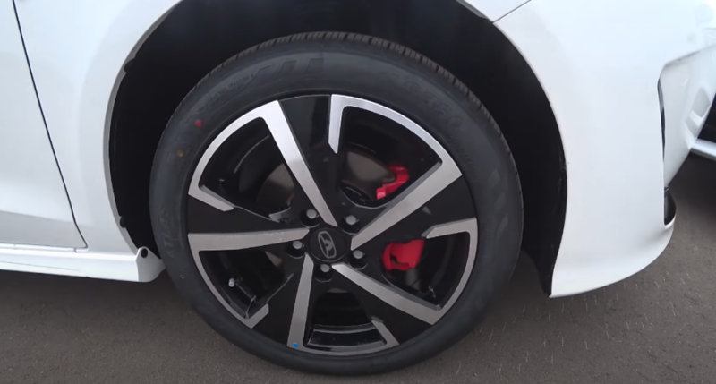 Поскольку китайская модель в люксовой комплектации, на ней установлены крупные 17-дюймовые двухцветные диски с красными спортивными суппортами. Обуты они в китайские шины фирмы Атлас.