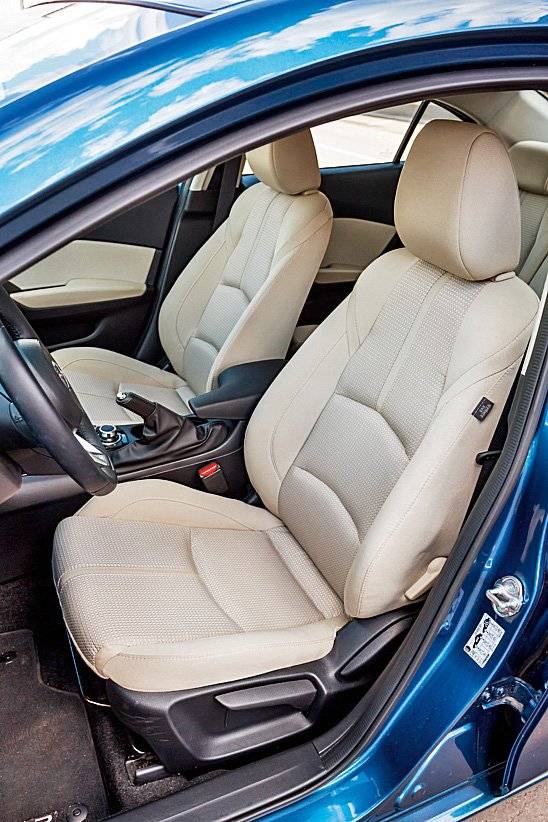 На фотографиях интерьер Mazda3 смотрится более современным и ярким, чем в жизни. Возможно, дело в том, что водитель не обращает внимания на светлую обивку, а перед глазами у него – лаконичные приборы и относительно низко расположенная консоль