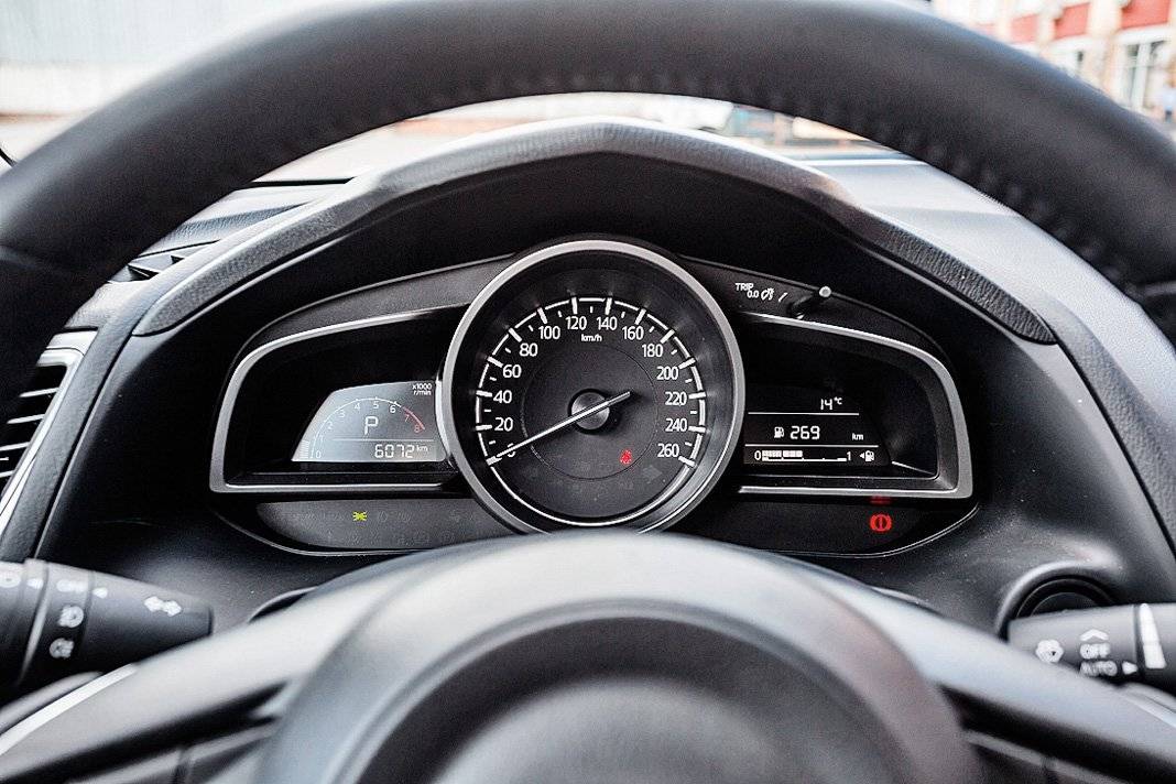 Приборная панель у Mazda3 – не самая характерная для японского автомобиля. Нет изобилия цветов и пиктограмм, все строго и просто. Может быть, даже слишком просто