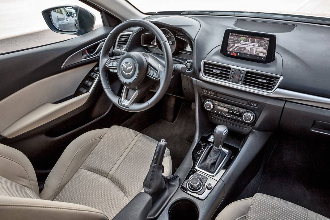 На фотографиях интерьер Mazda3 смотрится более современным и ярким, чем в жизни. Возможно, дело в том, что водитель не обращает внимания на светлую обивку, а перед глазами у него – лаконичные приборы и относительно низко расположенная консоль