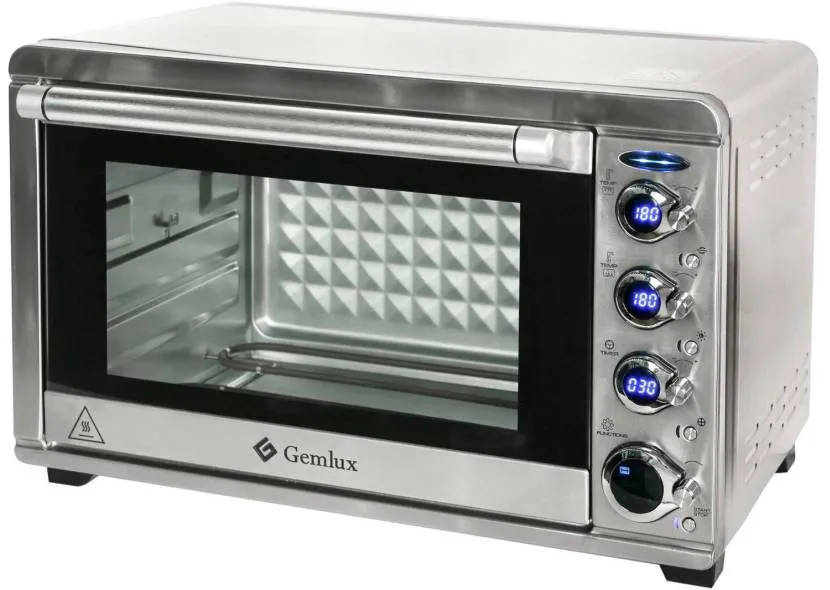 - Gemlux GL-OR-1538LUX. При объеме 38 л у агрегата электронное управление и лучший функционал: гриль, вертел, выпечка, запекание, размораживание и хлебопечка. Мощность конвекции – 1800 Вт.