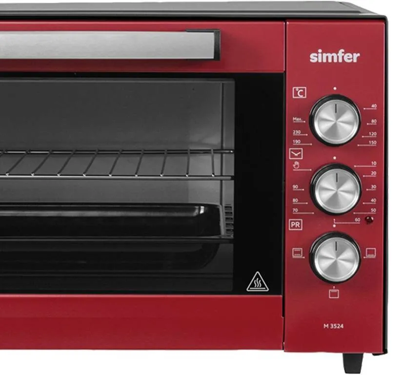 - Simfer M3524. Прибор темно-красного цвета объемом 35 л идеально подойдет для маленькой кухни, автодома, кабинета. Есть регулятор нагрева, таймер, три режима приготовления. Корпус и ножки термоизолированы, материал ножек не скользит по поверхности и не оставляет царапин.