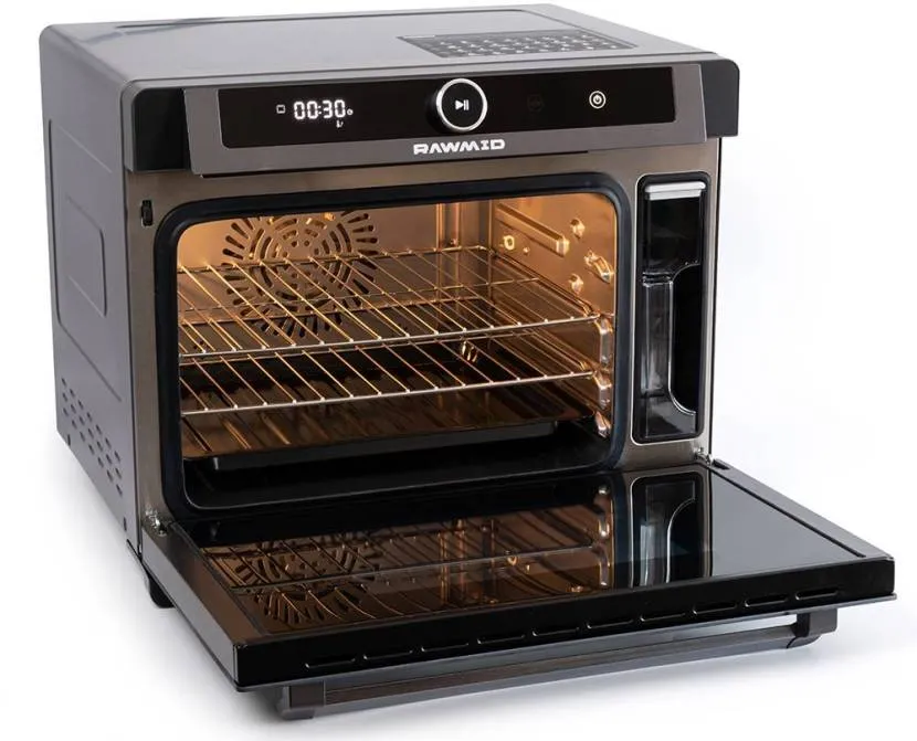 RAWMID Future RFM-01. Паровая конвекционная мини-печь предлагает три способа готовки: гриль (духовка), пропаривание и аэрофритюрница (обжарка потоком горячего воздуха); способы можно комбинировать. Объём камеры 40 л, 4 уровня для готовки (одновременно можно готовить разные блюда).