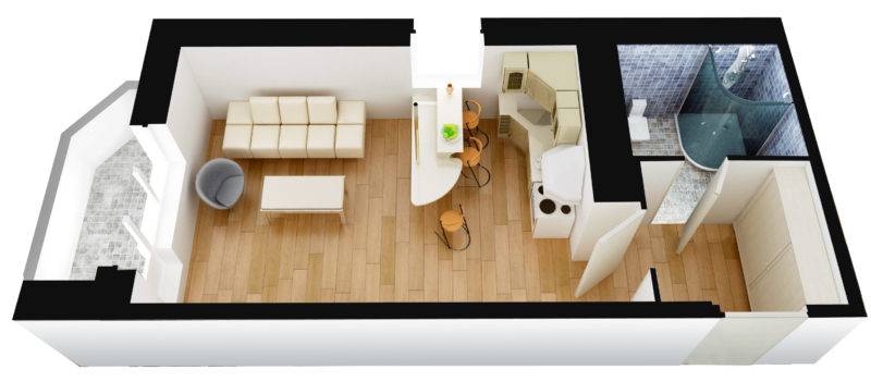Студии со сложной или необычной планировкой (острыми углами, большим количеством нефункциональных ниш и тд.) труднее зонировать, расставить мебель, поэтому их метраж должен быть более 30 кв. метров;