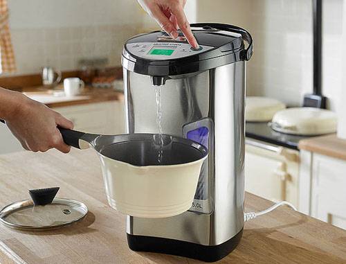 Чайник – легкий прибор: подняли, набрали, поставили. С термопотом сложнее. Пятилитровую емкость поднимать и набирать непросто. Для облегчения пользования многие модели оснащены насосом для набирания воды из системы. Только нужно учесть, что в таком случае вы не сможете пользоваться бутилированной водой или водой из кувшинного фильтра, а значит, фильтр для очистки должен стоять на водопроводе или в самом приборе.
