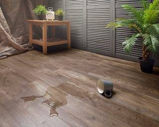 Кварцвиниловая плитка не боится влаги и прямого действия воды. В стык между элементами жидкость не попадает, да и материал основного слоя обладает водостойкостью. При попадании горячей воды (свыше +45°С) рекомендуется сразу ее вытереть, своевременная уборка не вызовет деформации.