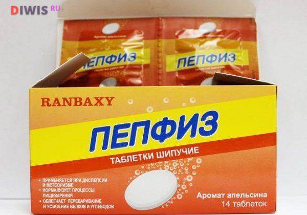 Это лекарство отличается формой выпуска. Оно производится в виде шипучих таблеток, быстро проникающих в желудок и кишечник. Пепфиз способен устранить сразу несколько проблем: колиты, панкреатит, газообразование, дисбактериоз, раздражение кишечника.