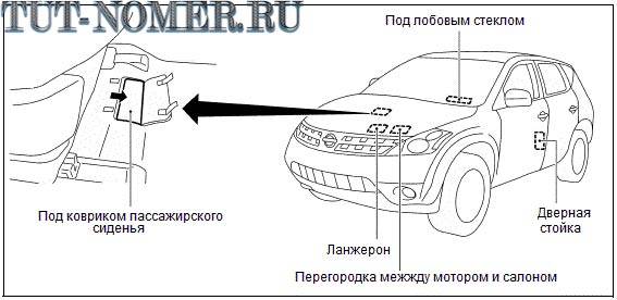 Что касается места расположения VIN, на Nissan это связано с особенностью конструкции каждой модели в отдельности. Часто идентификатор крепится на перегородке между силовой установкой и салоном. Так же маркер встречается под передним стеклом, на переднем правом лонжероне (Terrano), или под автомобильным ковриком пассажира. Машины Ниссан Кашкай оснащаются номерами, закреплёнными между дверями на стойке справа.