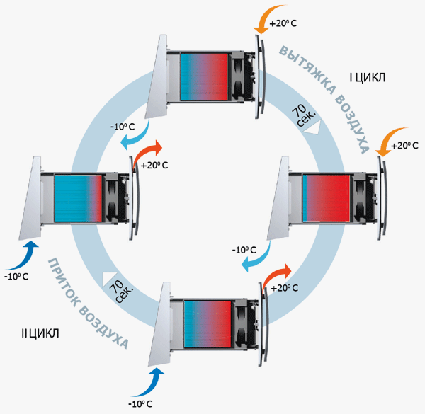 Теперь о проветривателях. Их модификация, называемая «бризер», имеющая функцию климат-контроля, подогревает воздух в помещении до заданной пользователем температуры вне зависимости от температуры за окном. Чем больше разница температур, тем эффективнее происходит нагрев. Большинство проветривателей без функции климат-контроля также подогревает воздух, но без возможности задания конкретного градуса – у прибора есть несколько мощностей нагрева, и чем выше эта мощность, тем теплее температура свежего воздуха в помещении. Рекуператоры нагревают воздух за счёт передачи тепла приточному воздуху от вытяжного. При наличии проветривателя, подогревающего воздух, не нужно тратиться на обогреватель. В случае рекуператора, подогрев даже не требует дополнительных затрат на электроэнергию.