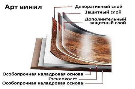Напольное покрытие Арт винил заявляется как новая разработка от российского производителя Tarkett. Это покрытие сочетает в себе достоинства ламината, керамической плитки и линолеума.