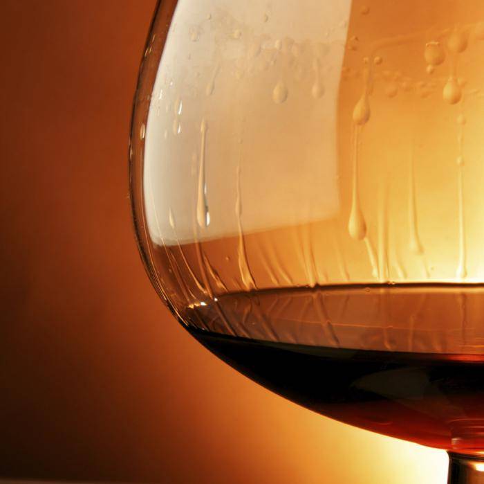 - Налейте в бокал 30-50 мл коньяка и наклоните его, чтобы оценить цвет и консистенцию напитка.