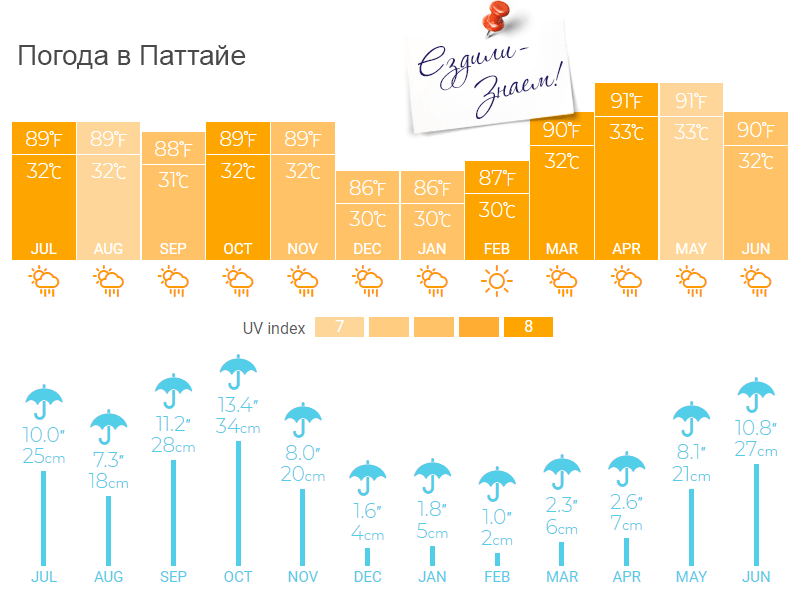 В Паттайе средняя температура +32°C, температура воды +28°C. В Паттайе погода жаркая круглый год. Сезон дождей в Паттайе проходит «легче», чем на Пхукете. Потому что Паттайя расположена на материке, а не на острове.