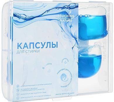 Высококонцентрированные капсулы для стирки светлого, в том числе, белого белья Touching Nature продаются по 6 шт. в упаковке. Однако их размер больше, чем у остальных средств в этом рейтинге, а потому расход достаточно экономичный. Их применяют для загрузки в стиральную машинку, в которой за счет тонкой оболочки они растворяются довольно быстро.