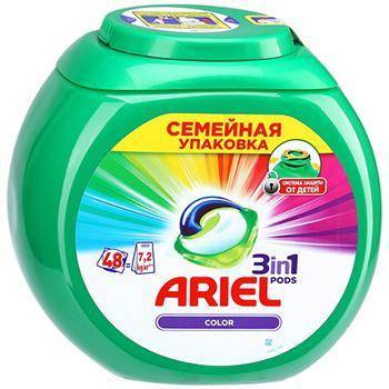 Ariel Color 3 в 1 смягчает волокна, облегчает глажку одежды и делает ее носку приятной для тела. Они придают вещам приятный аромат, который сохраняется в течение длительного времени. Средство подходит для стирки светлого и цветного белья из хлопка, вискозы, льна и других натуральных тканей, хотя и синтетические по типу полиэстера также «берет». Для достижения идеальной чистоты достаточно одной штуки.