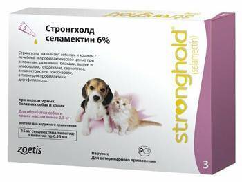 Zoetis представляет собой бесцветную либо светло-желтую жидкость для наружного применения с действующим веществом селамектином (6%). Средство хорошо переносится собакой и не вызывает побочных реакций. Для нанесения состава подходит область в нижней части затылка либо между лопатками. Препарат разрешен к использованию для обработки против клещей особей старше 1,5 месяцев.