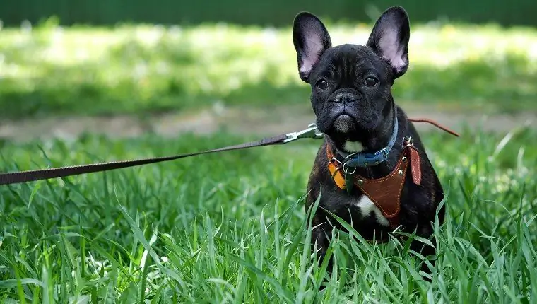 Собака на поводке и упряжке на прогулке. Зеленая трава. Родословная французского бульдога