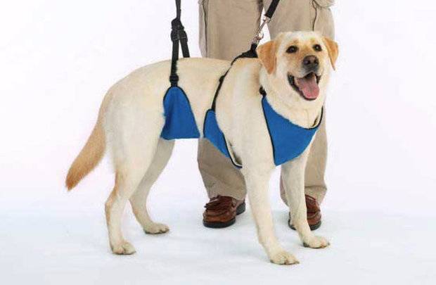 Жилет охватывает большую (порядка 2/3 туловища) площадь, а крепление выведено к задним лапам. Таким образом они разгружаются, а опорной становится передняя пара конечностей.