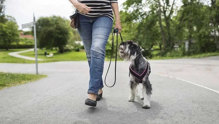 Низкая часть пожилой женщины гуляет с собакой на улице