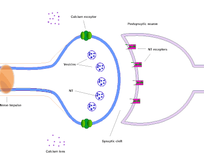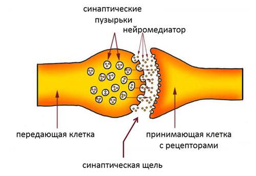 В передающей клетке синапса имеются синаптические пузырьки, содержащие биологически активное вещество (нейромедиатор). Под влиянием импульса пузырьки выходят в синаптическую щель, выделяют нейромедиатор, который соединяется с особыми белками (рецепторами) на принимающей стороне и запускает определенные процессы, о которых будем говорить дальше.