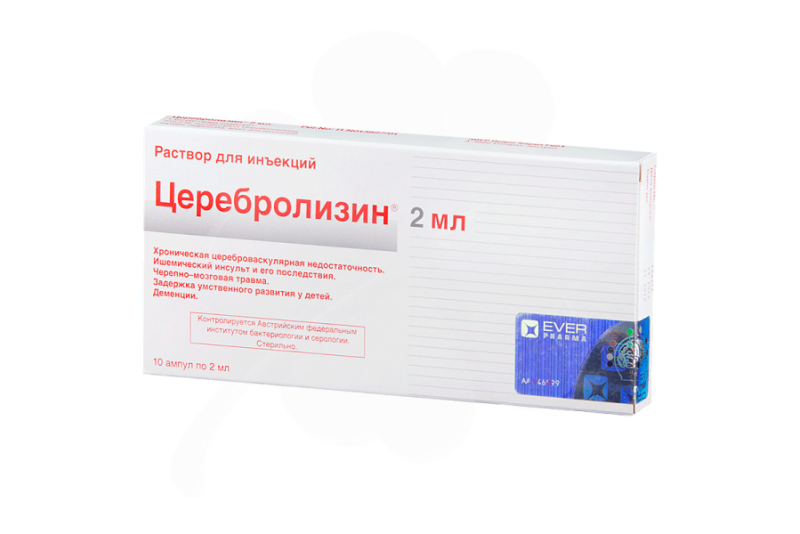 - Церебролизин — применяется, как внутримышечные инъекции. Курс лечения зависит от состояния пациента и длится от 10до 20 суток. Показан при инсульте, осложнениях, вызванных нейрохирургическим вмешательством, травмах головы, психоорганическом синдроме и депрессивных состояниях, болезни Альцгеймера, в нейропедиатрии.