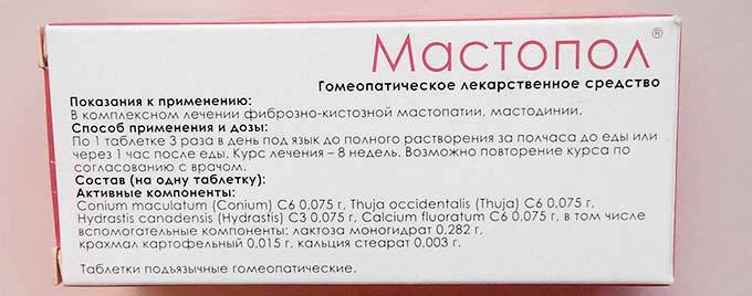 | Мастопол | Гомеопатический препарат. Лекарственная форма – таблетки и гранулы. Устраняет симптомы и причины болезни. Не провоцирует побочных эффектов (в редких случаях). Способен нормализовать гормональный фон. | Имеет противопоказания к своему приему. Лекарство нужно принимать длительно. Используется только в комбинации с другими медикаментозными средствами. |