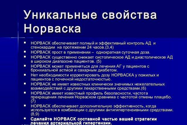Норваск используется самостоятельно и в составе комплексной терапии гипертензии, стабильной и вазомоторной стенокардии.