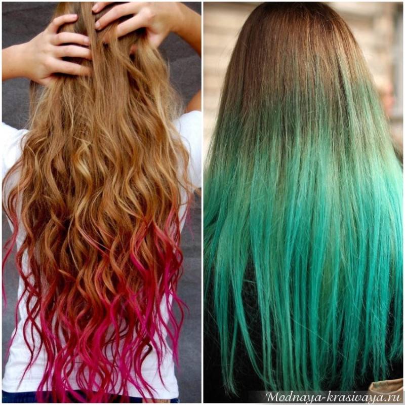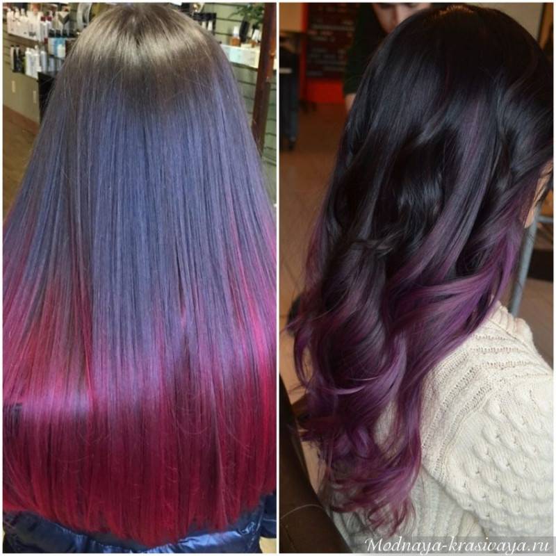 Если в шатуш идет переход только от темного к светлому, то в омбре все может быть с точностью до наоборот. Еще и оттенки не обязательно стремятся к естественным — тут место экспериментам с самыми разными цветами, вплоть до оранжево-розово-фиолетовых оттенков. Основная мысль такая: половина ваших волос от корней будет иметь свой родной оттенок, а все остальное вы вольны выкрасить, как захочется — в приближенный тон или контрастный, или просто яркий. Главное, чтобы к кончикам волос красочное сияние набрало всю свою силу и интенсивность. Сочетание нескольких цветов приветствуется для самых смелых.