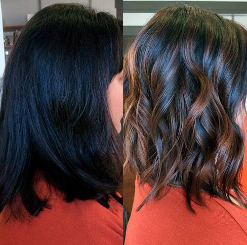 На фото представлен балаяж волос до и после окрашивания. Как мы видим волосы действительно зрительно приобретают густоту и лоск.
