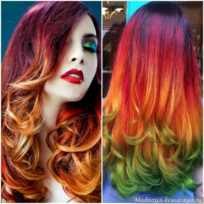 Если в шатуш идет переход только от темного к светлому, то в омбре все может быть с точностью до наоборот. Еще и оттенки не обязательно стремятся к естественным — тут место экспериментам с самыми разными цветами, вплоть до оранжево-розово-фиолетовых оттенков. Основная мысль такая: половина ваших волос от корней будет иметь свой родной оттенок, а все остальное вы вольны выкрасить, как захочется — в приближенный тон или контрастный, или просто яркий. Главное, чтобы к кончикам волос красочное сияние набрало всю свою силу и интенсивность. Сочетание нескольких цветов приветствуется для самых смелых.
