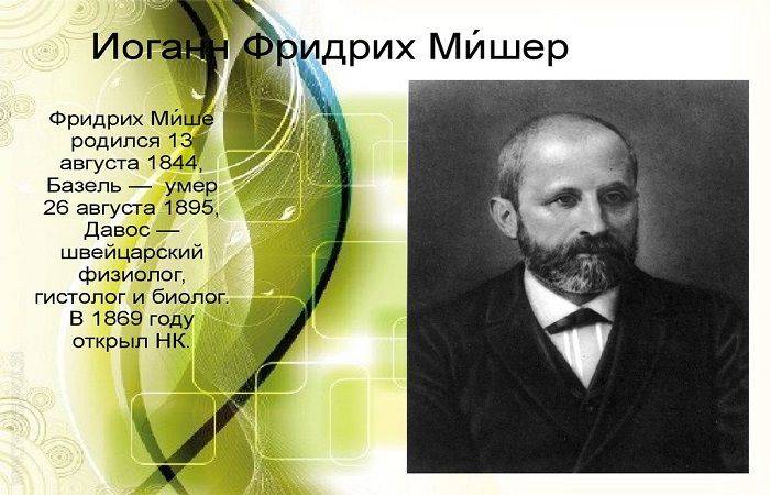 Первыми нуклеиновые кислоты описал швейцарский биохимик Фридрих Мишер. Это произошло еще в 1869 году. Из остатков клеток в гное ему удалось выделить вещество с содержанием азота и фосфора. Исследователь назвал его нуклеином. Он считал, что данный элемент присутствует лишь в клеточном ядре. Позднее небелковую часть вещества назвали нуклеиновой кислотой.